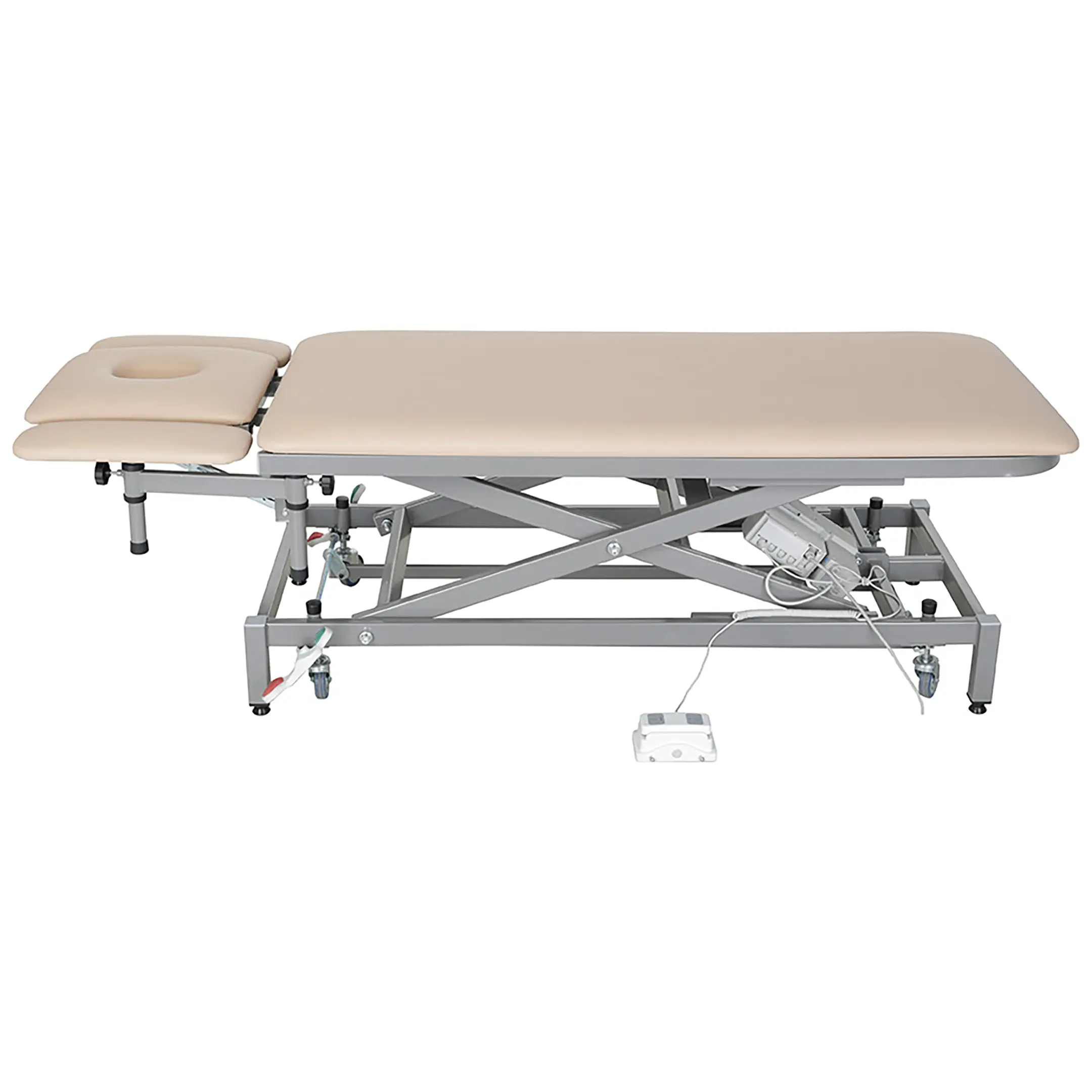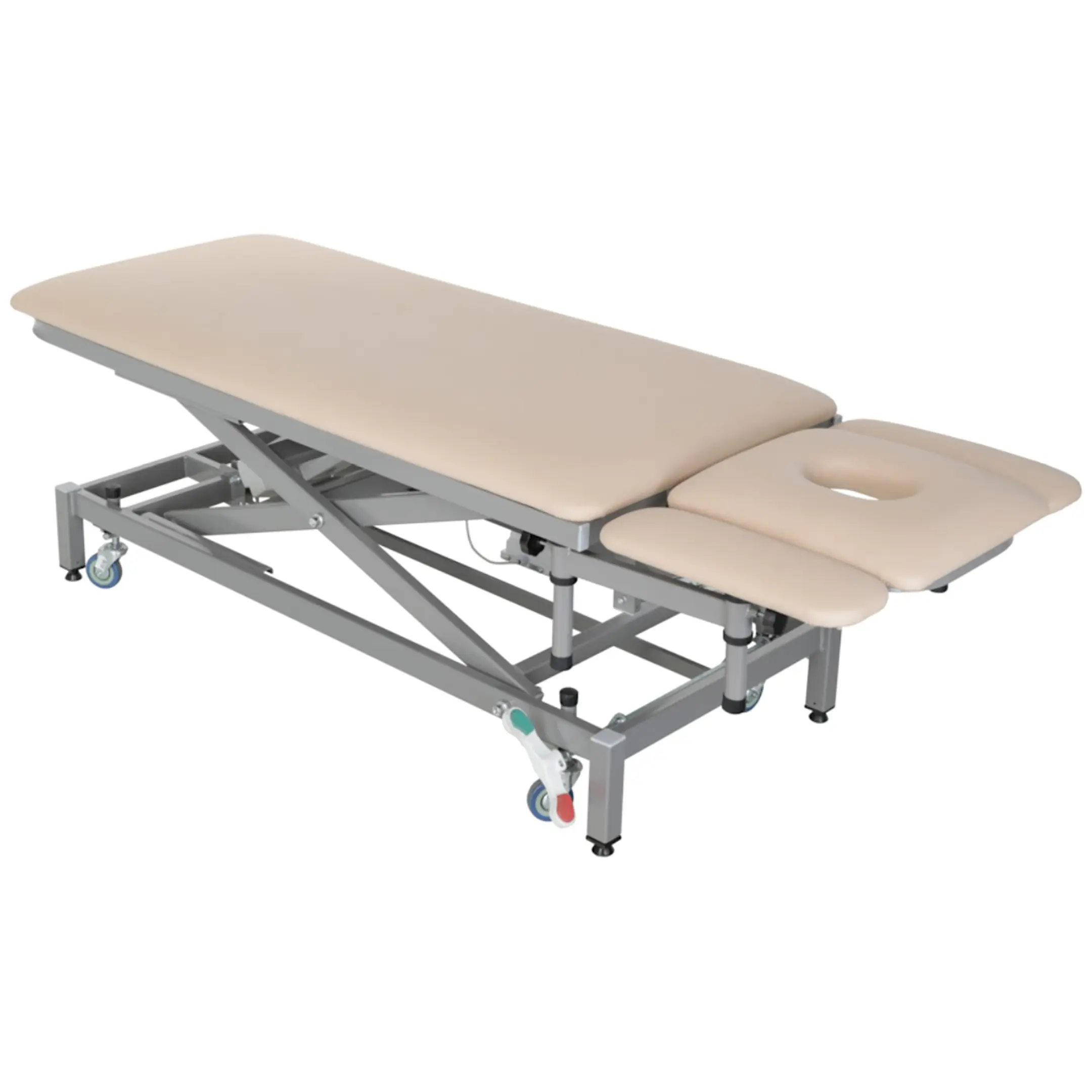 • массажный стол установлен на 4 регулируемые опоры с возможностью перехода на самоориентирующиеся колеса, ∅ 75 мм, из немаркой серой резины, не оставляющего следов на полу для перемещения стола;