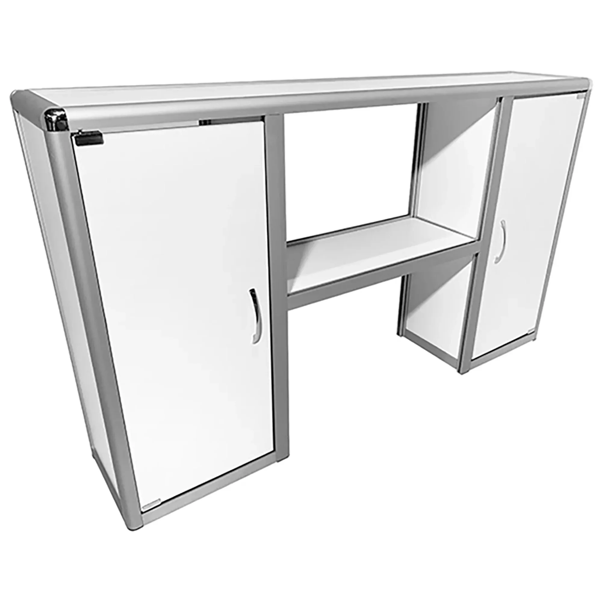 - Функциональная организация пространства — две полки и две боковые тумбы с распашными дверцами для удобного хранения лабораторного инвентаря.