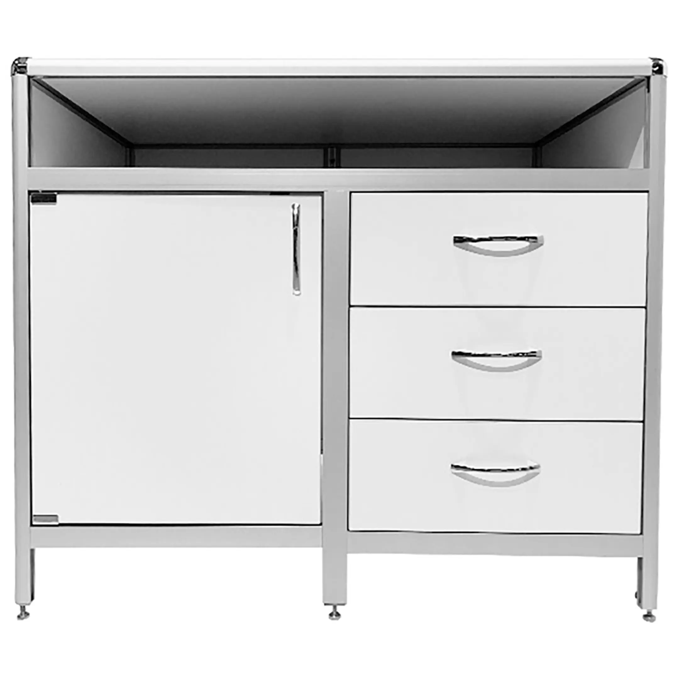 Стол-тумба лабораторная MED 12.008al (белый) — это функциональное решение для хранения лабораторного инвентаря, приборов и материалов в лабораториях и медицинских учреждениях. Модель оснащена вместительной нишей под столешницей (940х540х139 мм), тумбой с дверкой и полкой внутри, а также отделением с тремя выдвижными ящиками (434х70х406 мм). Каркас выполнен из алюминиевого профиля, столешница из ЛДСП толщиной 16 мм.