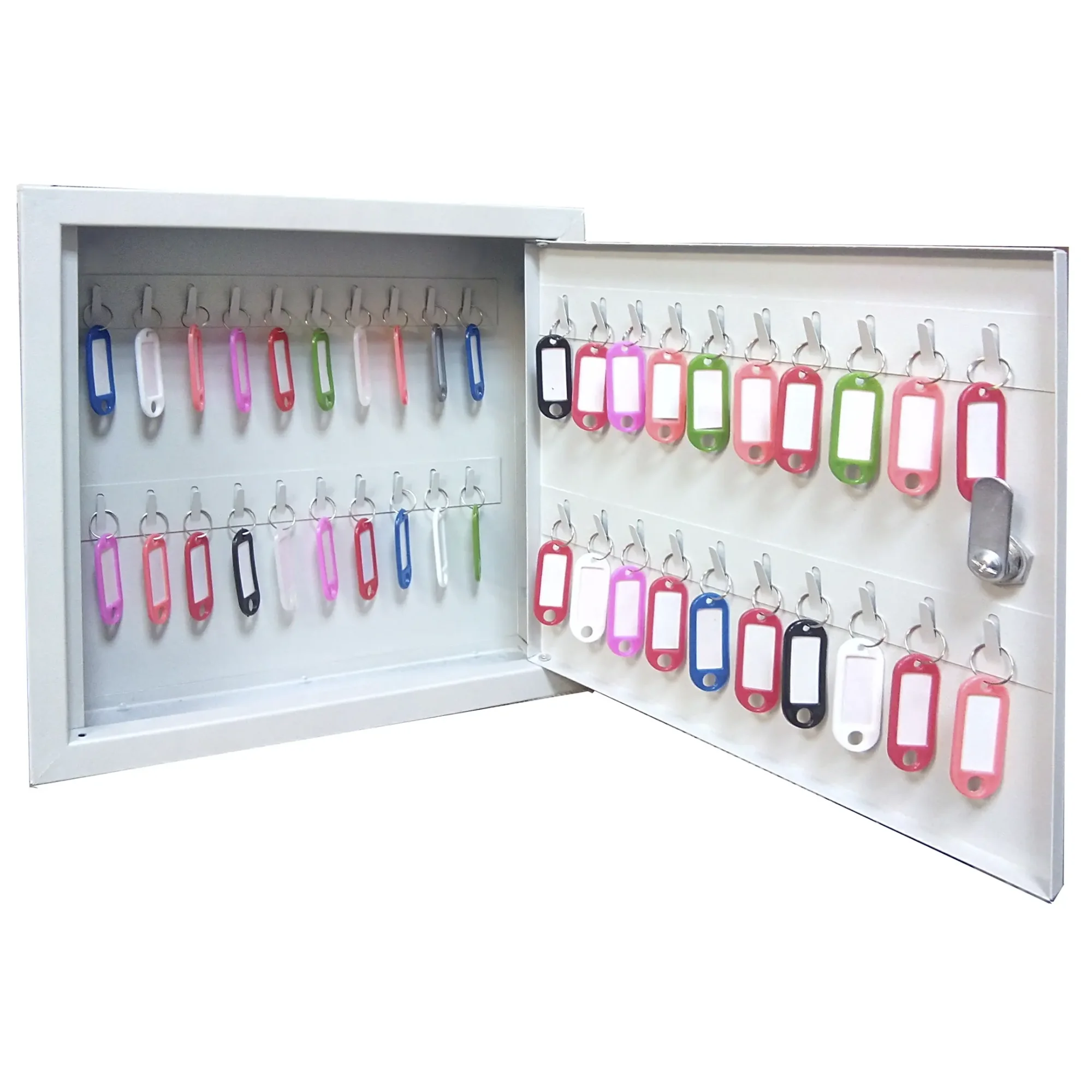 - Компактность и достаточная вместимость для типовых задач — ключница рассчитана на хранение 40 ключей, что является оптимальным решением для объектов с ограниченным количеством помещений, таких как небольшие офисы, студии, салоны, кабинеты или пункты приема клиентов. Ее размеры позволяют легко разместить шкаф на стене в удобном месте, не занимая много пространства.
