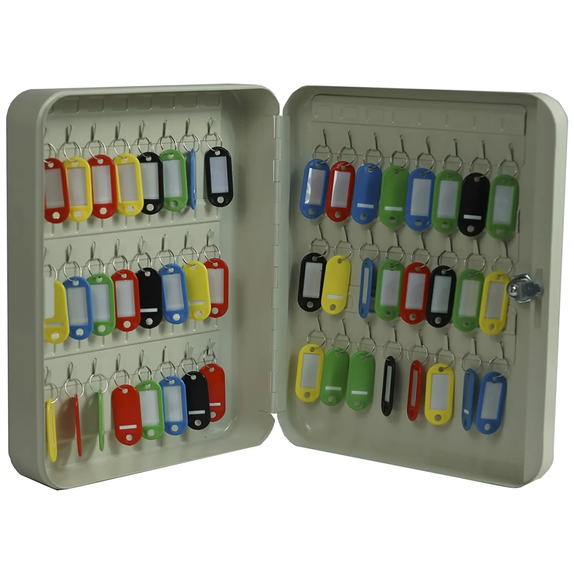 - Готовая система для точного учета и быстрого поиска — сорок восемь пронумерованных ячеек и комплект соответствующих брелков создают четкую и прозрачную систему. Это позволяет вести точный журнал учета, мгновенно находить требуемый ключ и однозначно определять ответственность сотрудников за их выдачу и возврат, исключая ошибки и потери времени.