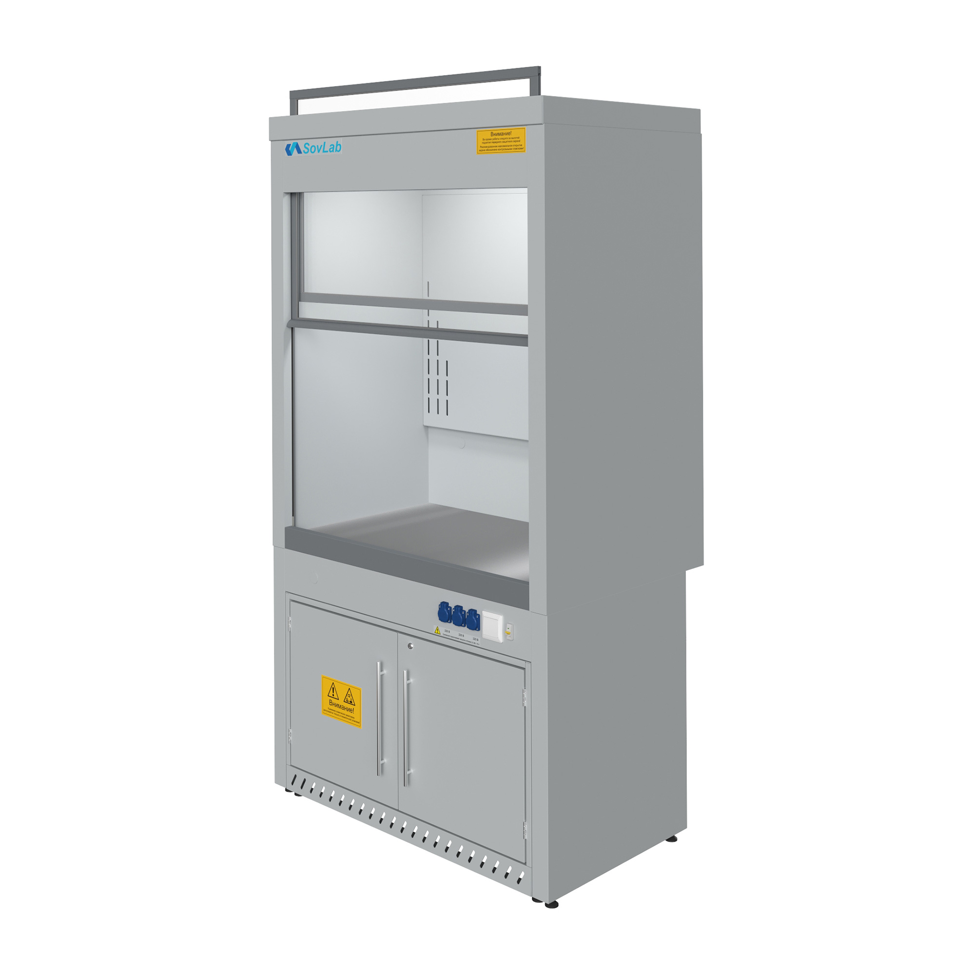 - Безопасная работа с летучими веществами — вертикально-подъемный защитный экран из ударопрочного стекла с системой противовесов для плавного хода и фиксации.
