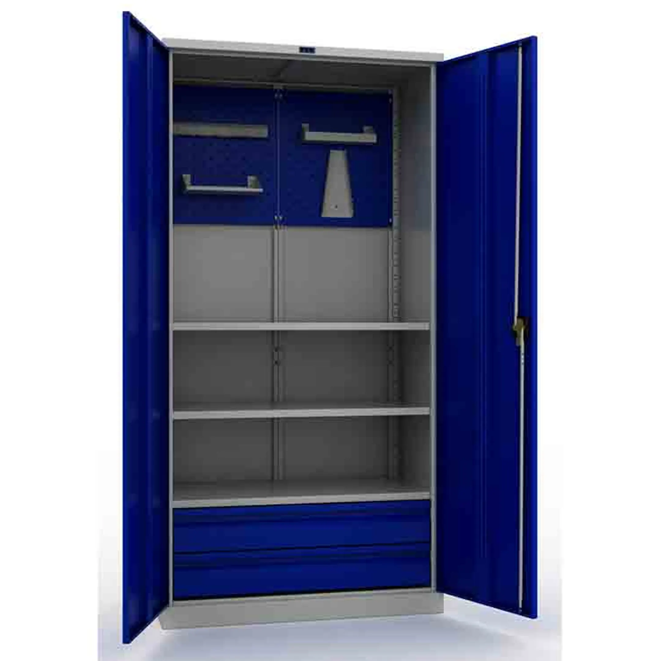 - Наглядная организация и быстрый доступ — модель оборудована перфорированными панелями (система «перфо») на дверцах, позволяя удобно и компактно разместить основной ручной и измерительный инструмент на крючках и держателях. Такая организация обеспечивает мгновенный визуальный контроль наличия инструмента и исключает его потерю.