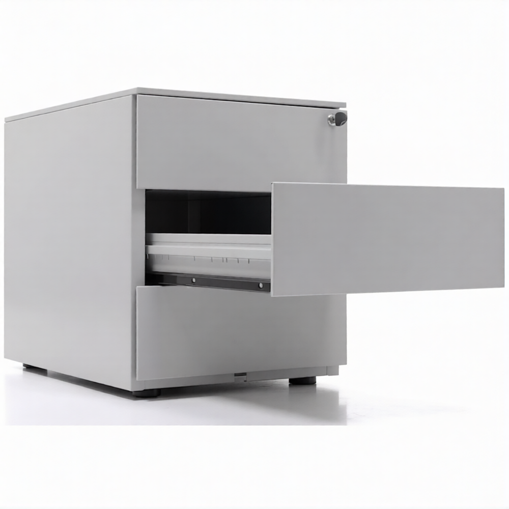 Опции: пластиковые лотки и металлический ящик для канцелярских принадлежностей и других предметов. Возможность комбинирования цветов: корпус + фасады ящиков и крышка (конструкция тумбы металл+металл). Или отделка фасадов ящиков и крыши тумбы ламинированной плитой ЛДСП (конструкция тумбы металл+ЛДСП)