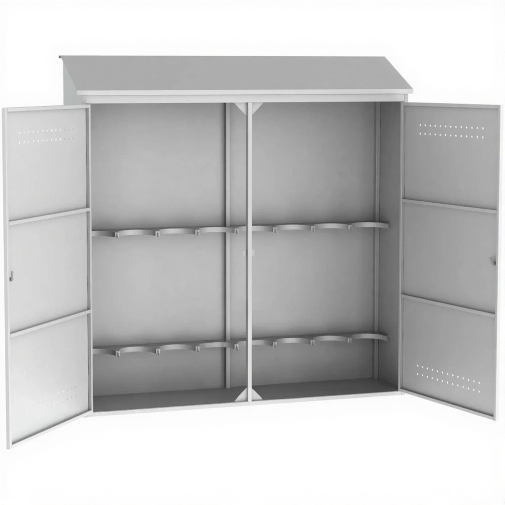 - Надежная защита от краж и внешних повреждений — прочный корпус с надежными запирающимися дверями защищает баллоны и имущество от хищений, несанкционированного доступа, а также от механических повреждений, пыли и атмосферных воздействий при установке под навесом.