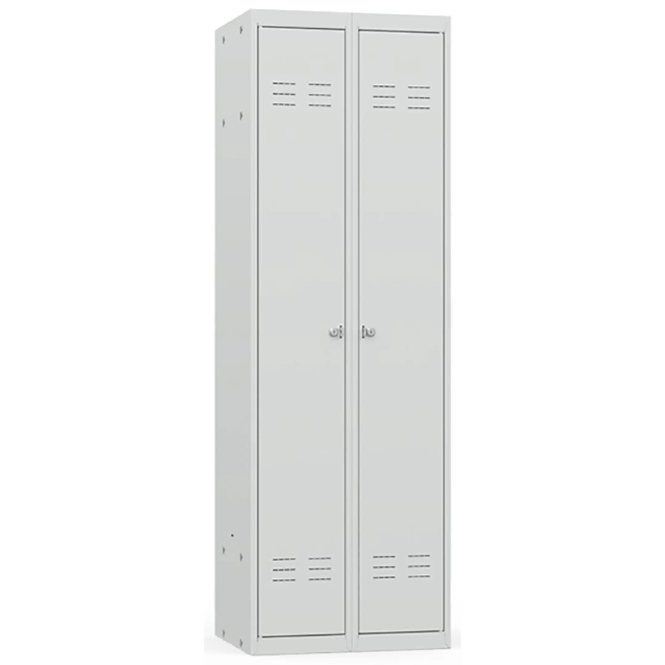 • Шкаф имеет две секции, каждая из которых оснащается полкой для головных уборов, пластиковыми перекладиной для вешалок и двумя крючками для одежды, проушиной для навесных замков;