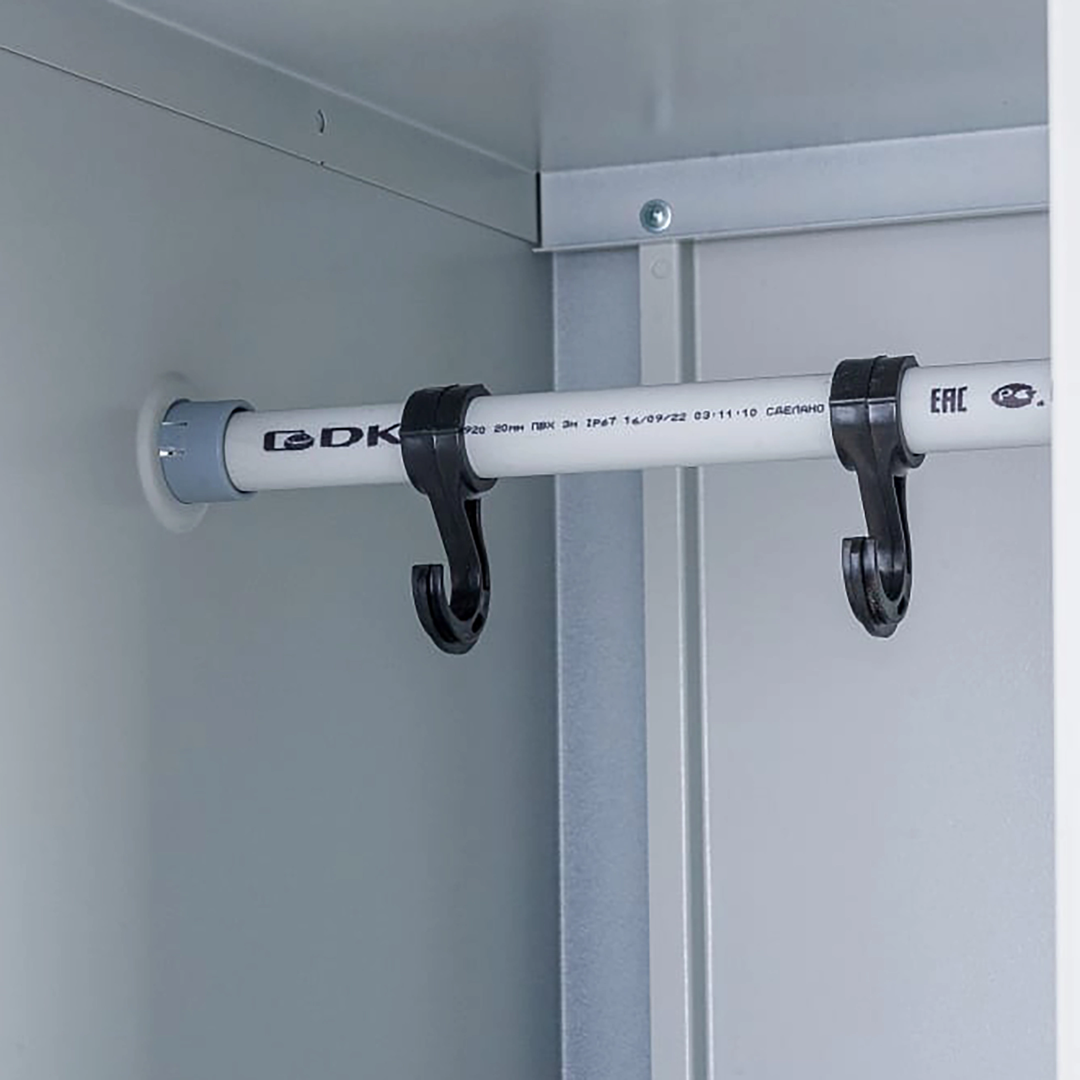 - внутри перекладина для вешалки, крючки для одежды и врезной замок;
