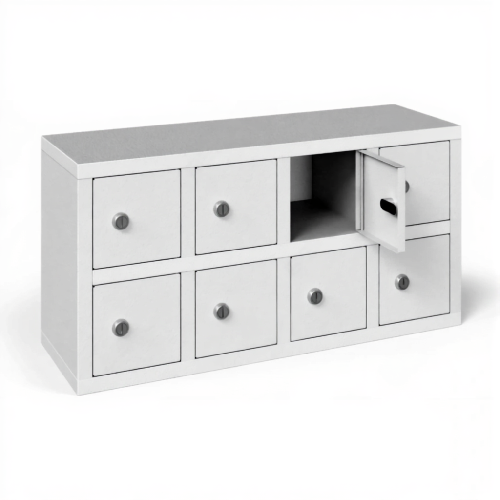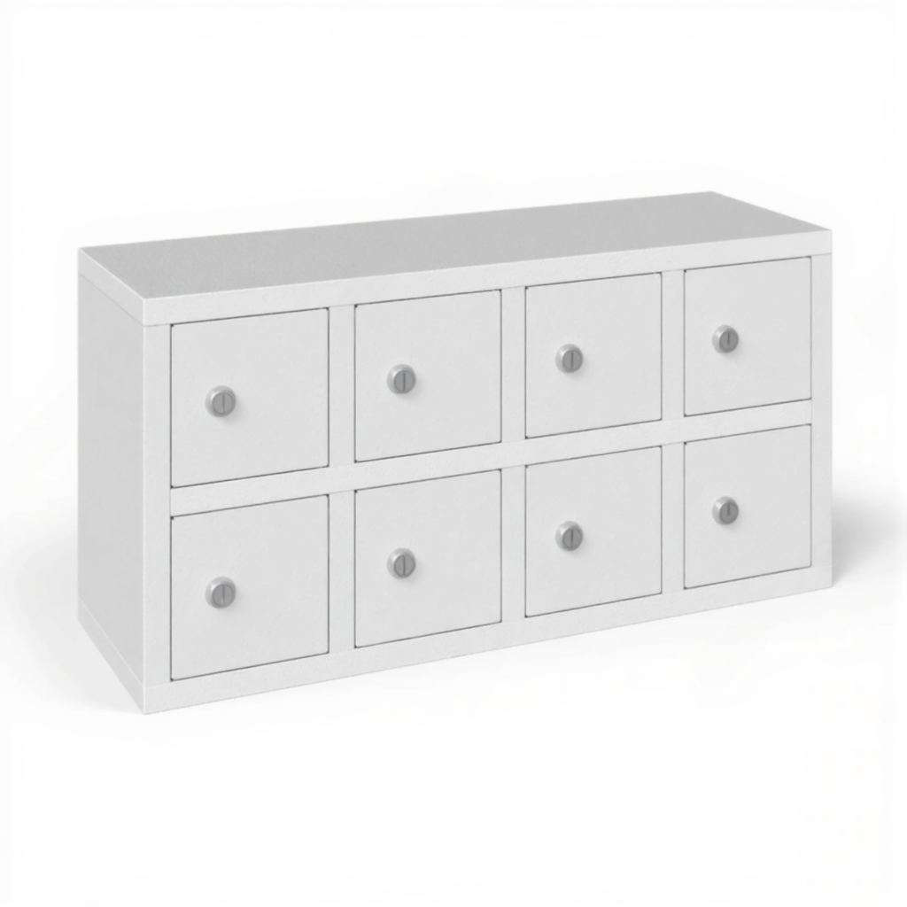 - Максимальная компактность и экономия пространства — шкаф предоставляет 8 индивидуальных запирающихся ячеек, занимая при этом минимальную площадь. Его можно легко разместить на краю рабочего стола, прилавке, полке или в нише, что делает его идеальным для мест, где каждый сантиметр на счету.