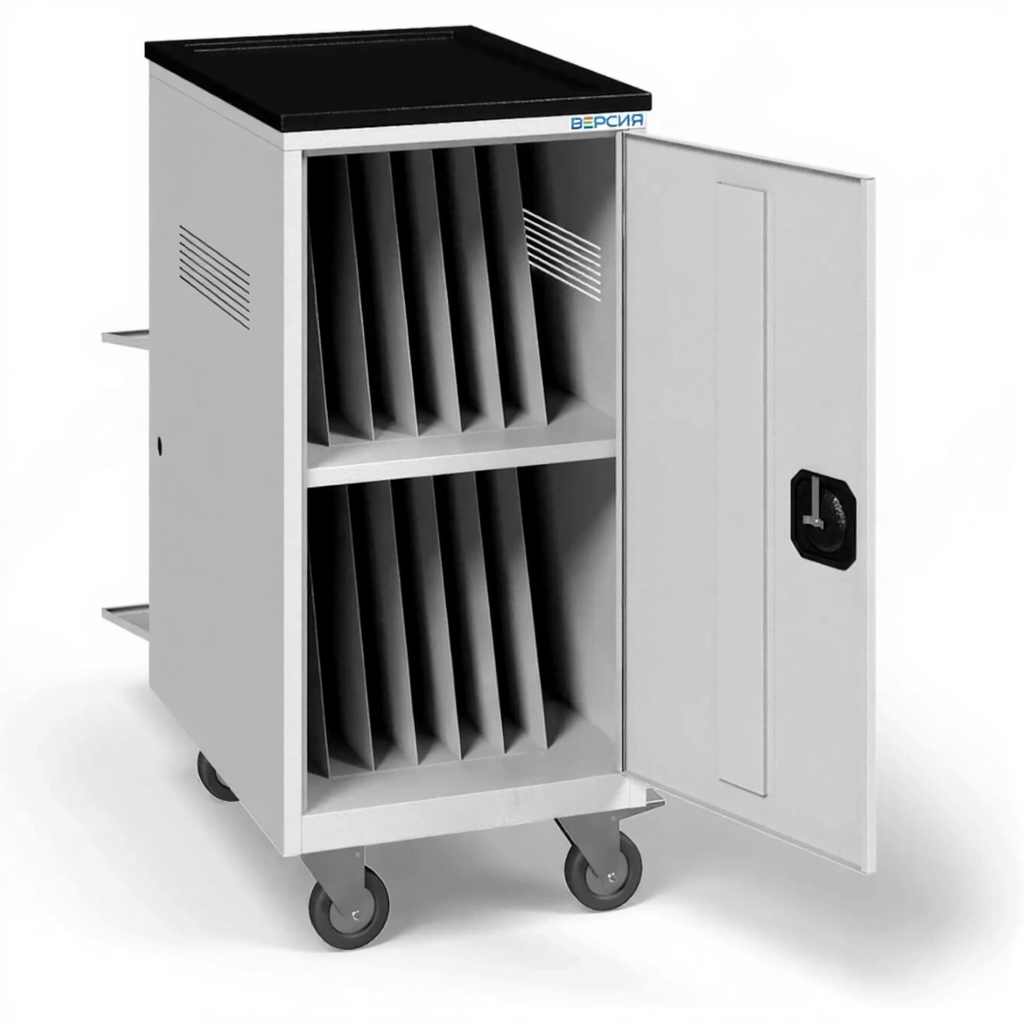Тележка для хранения и зарядки 14 ноутбуков (17,3 дюймов) с электросхемой — это специализированное и надежное решение для организации мобильного рабочего пространства, оснащенного ноутбуками увеличенного формата для профессиональных задач. Модель представляет собой защищенную мобильную тележку с интегрированной системой электропитания, рассчитанную на 14 ноутбуков с диагональю 17,3 дюйма. Она обеспечивает комплексную защиту, удобную транспортировку и гарантированную синхронную зарядку всего парка мощных устройств, используемых в сферах дизайна, программирования, инженерии и науки.